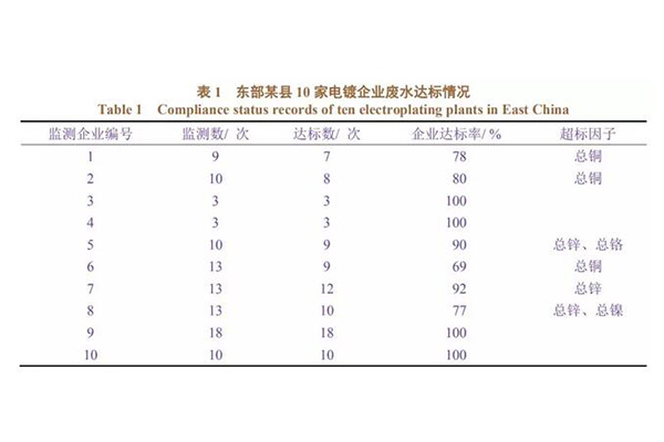根据在我国东部某县调研获得的当地电镀企业废水达标排放情况进行分析(见表1),电镀企业的超标因子主要集中在总铜、总锌、总铬和总镍。