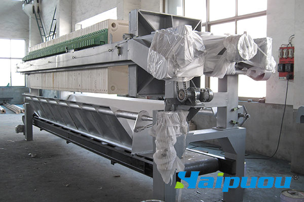 工作原理:在密闭的状态下,经过高压泵打入的污泥经过板框的挤压,使污泥内的水通过滤布排出,达到脱水目的。