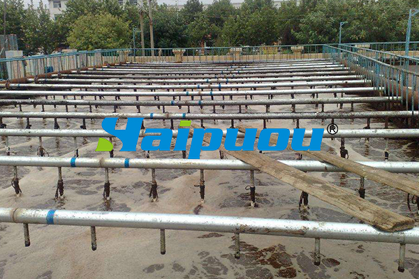 污水和回流的活性污泥一起进入曝气池形成混合液。从空气压缩机站送来的压缩空气,通过铺设在曝气池底部的空气扩散装置,以细小气泡的形式进入污水中,目的是增加污水中的溶解氧含量,还使混合液处于剧烈搅动的状态,呈悬浮状态。溶解氧、活性污泥与污水互相混合、充分接触,使活性污泥反应得以正常进行。