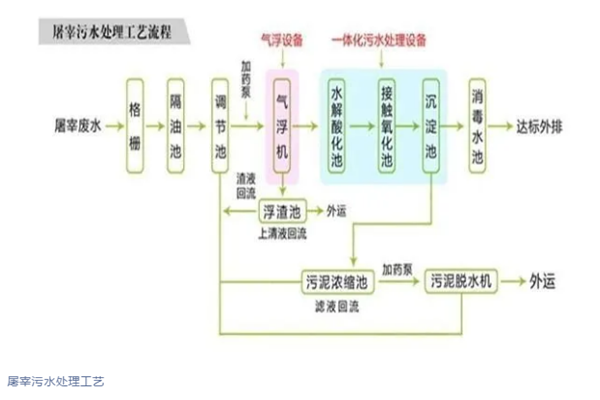 屠宰加工废水中含有大量的血液油脂、毛皮、碎肉骨屑、内脏垃圾、未消化的食物、粪便等污染物,一般通过格栅去除粒子大的浮游物和污染物,然后通过气浮去除细小的浮游物、油脂、色度。
