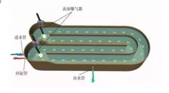 氧化沟具有推流特性,使得溶解氧浓度在沿池长方向形成浓度梯度,形成好氧、缺氧和厌氧条件。通过对系统合理的设计与控制,可以取得较好的脱氮除磷效果。