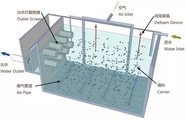 MBBR工艺还结合了活性污泥法和生物膜法的基本原理,兼有传统流化床和生物接触氧化工艺的优点。在A2/O或A/O活性污泥反应器中加入一定量的悬浮填料,填料在曝气和水流的作用下处于流化状态,形成悬浮活性污泥和附着生物膜,提高反应器中的生物量和生物种类。填料在水中的碰撞和剪切作用使气泡变小,提高了氧气的利用率,促进了填料表面生物膜的更新,从而提高了处理效果。