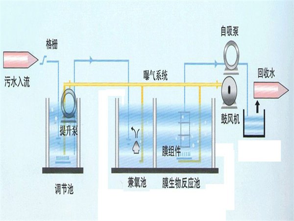 工作原理:污水通过污水进水管进入格栅池,污水通过格栅池内的格栅截留悬浮物进入调节池,油滤后通过提升泵进入兼氧池。污水通过反硝化反应池中的氨氮污染物进入调节池,使MBR膜池中的氨氮污染物进入调压池,污水在污水中降解有机物,通过一级流化池中的氨氮沉淀池回流,使MBR膜池回流到二级回流池。