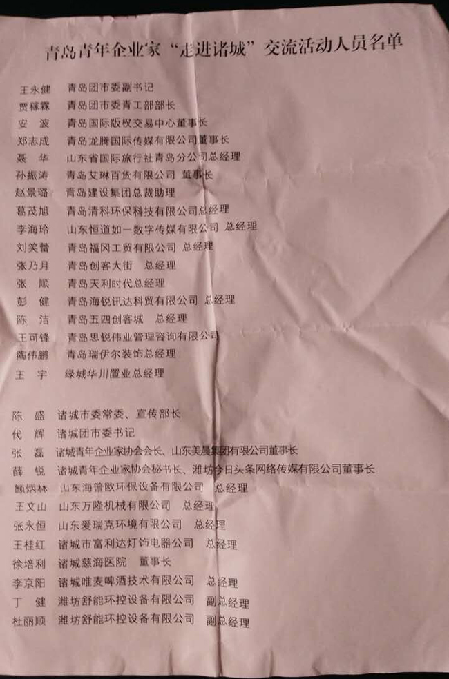 2016年8月19日,由青岛团市委与诸城宣传部、团市委、诸城青年企业家协会联合发起的“青岛青年企业家‘走进诸城’交流活动”在诸城举行。本活动不但联合了青岛青年企业家与诸城青商…