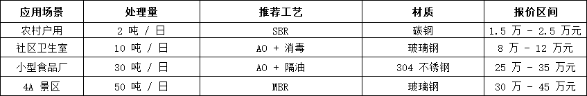 •微型设备(≤5 吨 / 日):适配农家乐、独栋办公楼,采用 SBR 简易工艺 + 碳钢材质,报价集中在 1.5 万 - 5 万元,如 1 吨 / 日农村户用设备约 2 万元;