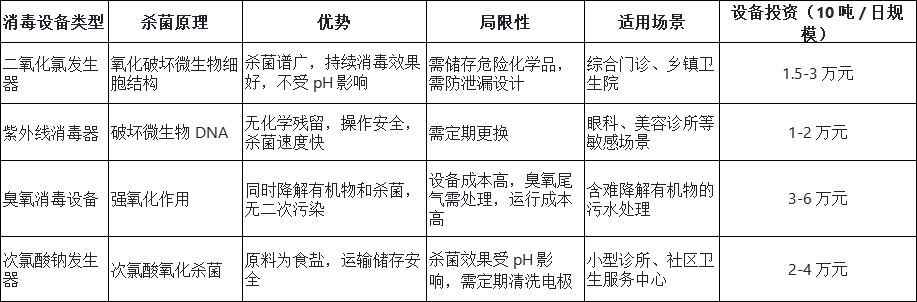 消毒是医疗污水处理的核心环节,不同消毒设备的性能差异显著: