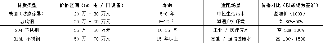 •医疗废水:必须配备紫外线消毒系统,罐体做防腐处理,价格比同规模生活污水设备高 20%-30%,10 吨 / 日设备约 8 万元。